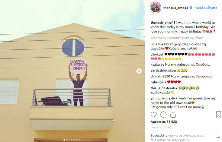 Μέσω του Instagram και ο Θανάσης Αντετοκούνμπο δημοσίευσε μι φωτογραφία στην οποία είχε γράψει σε μια ταμπέλα «Ηappy Birthday Mommy» και βγήκε στο μπαλκόνι, στον δρόμο, σε στάση του λεωφορείου και ανέβηκε πάνω σε μια γέφυρα, ώστε να το δουν… όλοι.