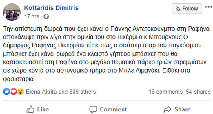 «Την απίστευτη δωρεά που έχει κάνει ο Γιάννης Αντετοκούνμπο στη Ραφήνα αποκάλυψε πριν λίγο στην ομιλία του στο Πικέρμι ο κ. Μπουρνους. Ο δήμαρχος Ραφήνας Πικερμίου είπε πως ο σούπερ σταρ του παγκόσμιου μπάσκετ έχει κάνει δωρεά ένα κλειστό γήπεδο μπάσκετ που θα κατασκευαστεί στη Ραφήνα στο μεγάλο θεματικό πάρκο τριών στρεμμάτων σε χώρο κοντά στο αστυνομικό τμήμα στο Μπλε Λιμανάκι. Ξιδάκι στα φασισταριά…», ήταν το χαρακτηριστικό του μήνυμα.