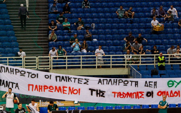 Οι «πράσινοι» οπαδοί που έδωσαν το παρόν στο γήπεδο, ανάρτησαν τρία πανό. Τα δύο είχαν αναφορές στον διαφαινόμενο υποβιβασμό των «ερυθρολεύκων» στην Α2 και στην ΚΑΕ Ολυμπιακός ενώ το τρίτο έγραφε: «20-5-1999 ΑΡΧΙΣΑΜΕ, 20-5-2019 ΣΑΣ ΤΕΛΕΙΩΣΑΜΕ», με ευθεία αναφορά στο πρωτάθλημα που κατάκτησε ο Παναθηναϊκός μέσα στο ΣΕΦ για πρώτη φορά.