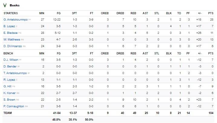 Σε 27′ που βρέθηκε στο παρκέ, ο Greek Freak είχε 28 πόντους, 10 ριμπάουντ, 3 ασίστ, 2 κλεψίματα και 1 μπλοκ.