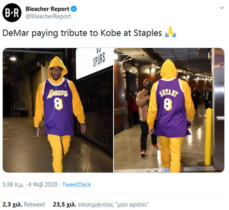 Ο ΝτεΜάρ ΝτεΡόζαν φόρεσε φανέλα Κόμπι Μπράιαντ κατά την είσοδο του στο Staples Center και με αυτόν τον τρόπο τίμησε τη μνήμη του ειδώλου του, Black Mamba.