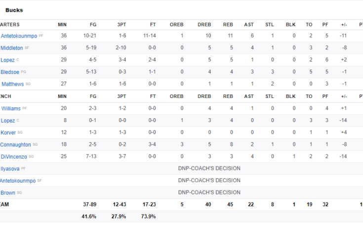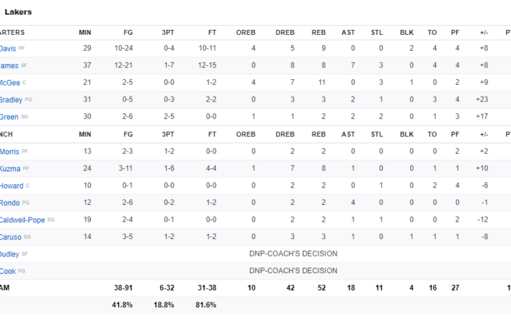 Ο Greek Freak τέλειωσε το ματς με 32 πόντους, 12 ριμπάουντ, 6 ασίστ, 1 κλέψιμο, όμως τα «ελάφια» δεν μπόρεσαν να αντισταθούν απέναντι στο δίδυμο των ΛεΜπρον και Ντέιβις, με τον «Βασιλιά» να έχει 37 πόντους, 8 ριμπάουντ και 7 ασίστ και τον AD να σημειώνει 30 πόντους και 9 ριμπάουντ.