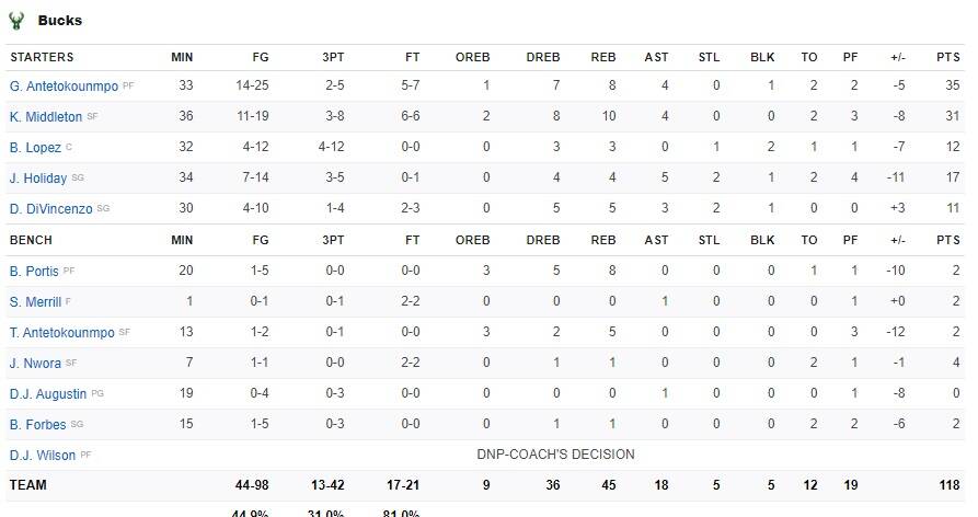 Ο Greek Freak σε 33′ είχε 35 πόντους, 8 ριμπάουντ και 4 ασίστ, κάτι που δεν ήταν αρκετό, με αποτέλεσμα οι δύο ομάδες να έχουν πλέον το ίδιο ρεκόρ (5-4).