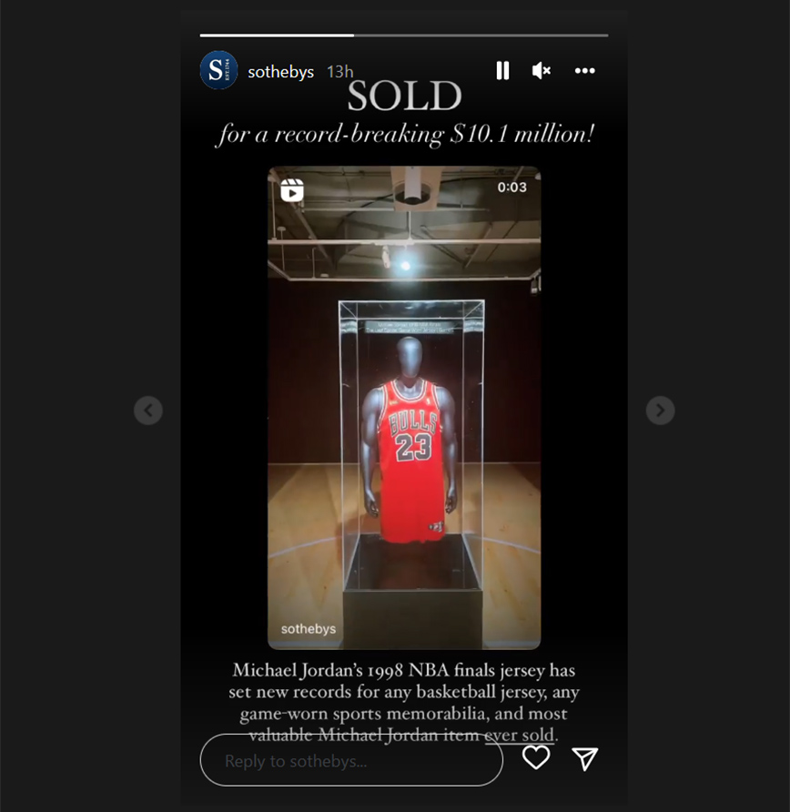 «Είναι ένα νέο ρεκόρ για μια φανέλα μπάσκετ σε δημοπρασία, ένα ρεκόρ για οποιοδήποτε αθλητικό αντικείμενο που είχε φορεθεί στο παρελθόν και το πιο ακριβό αντικείμενο που πωλήθηκε ποτέ από τη συλλογή του Μάικλ Τζόρνταν» αναφέρεται στο σχετικό δελτίο Τύπου, που δόθηκε στη δημοσιότητα από τον διάσημο Οίκο δημοπρασιών έργων τέχνης.