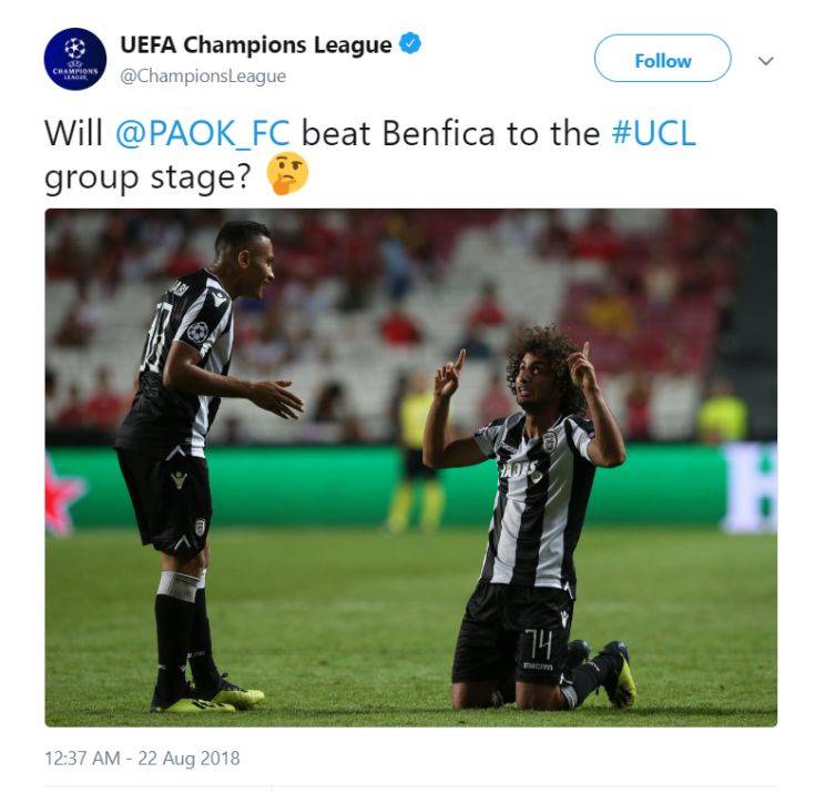 Ο επίσημος λογαριασμός της UEFA στο twitter έθεσε το ερώτημα για το αν ο ΠΑΟΚ θα αποκλείσει την Μπενφίκα με τον Δικέφαλο του Βορρά να επεμβαίνει στην ψηφοφορία. Μετά το 1-1 του Ντα Λουζ ο ΠΑΟΚ απέκτησε προβάδισμα έναντι της Μπενφίκα για την είσοδο στους ομίλους του Champions League. Η UEFA μέσω του επίσημου λογαριασμού της στο twitter αποφάσισε να θέσει το ερώτημα για το αν οι παίκτες του Ραζβάν Λουτσέσκου θα αποκλείσουν τους Πορτογάλους. Οι διαχειριστές του twitter του ΠΑΟΚ αποφάσισαν να τρολάρουν την UEFA ρωτώντας για το αν μπορούν και αυτοί να λάβουν μέρος στην ψηφοφορία.