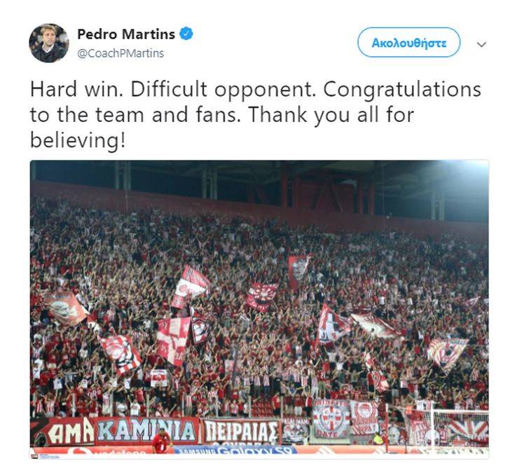 Μπορεί να χρειάστηκε τις καθυστερήσεις της αναμέτρησης, αλλά ο Ολυμπιακός κατάφερε με γκολ του Μπίμπαρς Νάτχο στο 92ο λεπτό να πάρει το τρίποντο κόντρα στον Αστέρα Τρίπολης, μια ομάδα που παραδοσιακά τον ζορίζει. Παρά τις δυσκολίες που παρουσίαζε η αναμέτρηση, ο κόσμος του Ολυμπιακού στήριξε μέχρι τη στιγμή της λύτρωσης την ομάδα του, γεγονός στο οποίο στάθηκε και ο Πέδρο Μαρτίνς με ανάρτησή του στο Twitter. «Δύσκολη νίκη, δύσκολος αντίπαλος. Συγχαρητήρια στην ομάδα και στους φιλάθλους. Σας ευχαριστώ που μας πιστεύετε» έγραψε ο Πορτογάλος τεχνικός στον προσωπικό του λογαριασμό.