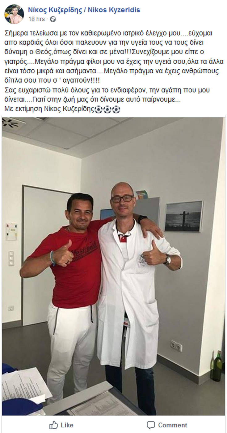 Μετά από έναν αγώνα που κράτησε πολλά χρόνια, ο Νίκος Κυζερίδης κατάφερε να βγει και από εκεί νικητής, αφού κατάφερε να κάμψει τη… σθεναρή αντίσταση του καρκίνου. Ο παλαίμαχος ποδοσφαιριστής με τη φανέλα των Νάουσας, Πανηλειακού, Πόρτσμουθ, Άρη, Βέροιας, Αγροτικού, Μακεδονικού και Αετού Σκύδρας ανέβασε χθες ένα μήνυμα στον προσωπικό του λογαριασμό στο Facebook, από όπου ενημέρωσε τους φίλους του για τη συγκεκριμένη εξέλιξη. Πιο συγκεκριμένα έγραψε: «Σήμερα τελείωσα με τον καθιερωμένο ιατρικό έλεγχο μου… εύχομαι από καρδιάς όλοι όσοι παλεύουν για την υγεία τους να τους δίνει δύναμη ο Θεός, όπως δίνει και σε μένα!!! Συνεχίζουμε μου είπε ο γιατρός… Μεγάλο πράγμα φίλοι μου να έχεις την υγειά σου, όλα τα άλλα είναι τόσο μικρά και ασήμαντα… Μεγάλο πράγμα να έχεις ανθρώπους δίπλα σου που σ’ αγαπούν!!!! Σας ευχαριστώ πολύ όλους για το ενδιαφέρον, την αγάπη που μου δίνεται… Γιατί στην ζωή μας ότι δίνουμε αυτό παίρνουμε.. Με εκτίμηση Νίκος Κυζερίδης».
