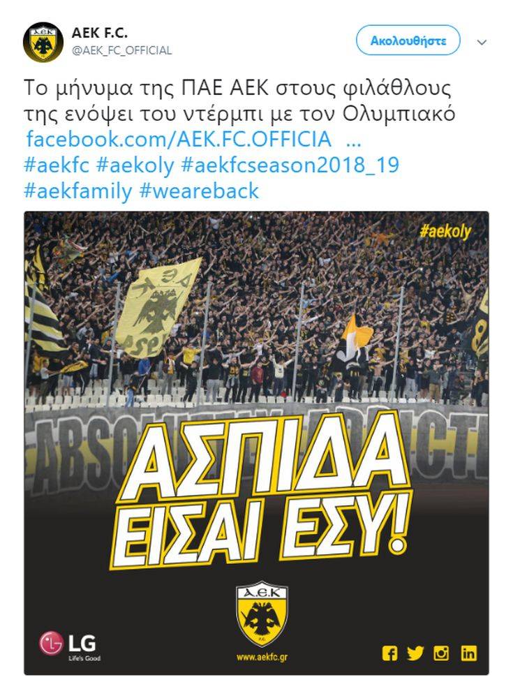 Αγνοούμε την όποια τυχόν πρόκληση και ασχολούμαστε μόνο με τη δική μας ομάδα, ενισχύουμε την προσπάθεια των ποδοσφαιριστών μας! Επιδεικνύουμε για ακόμα μια φορά τον ποδοσφαιρικό μας πολιτισμό! Η ασπίδα και η δύναμη της ομάδας μας είστε εσείς!».