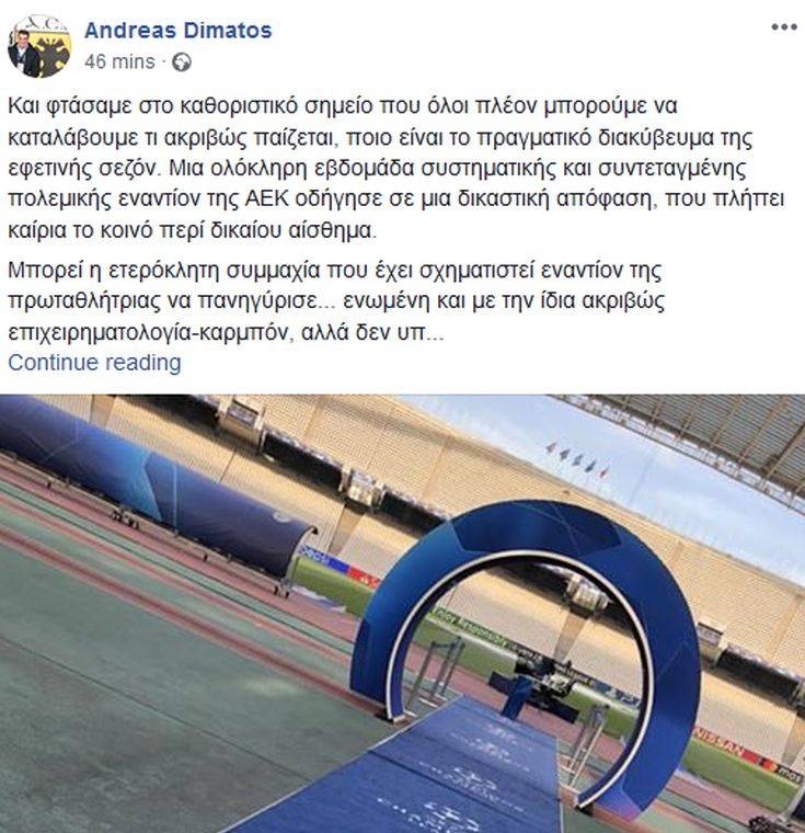 Ο υπεύθυνος επικοινωνίας της ΠΑΕ ΑΕΚ έστειλε διάφορα μηνύματα μέσω τοποθέτησης του στο facebook. Η απόφαση για -3 και δύο αγώνες κεκλεισμένων των θυρών έχει προκαλέσει οργή στις τάξεις της πρωταθλήτριας, με τον Ανδρέα Δημάτο να αναφέρεται αναλυτικά σε όσα γίνονται στο φετινό πρωτάθλημα, κάνοντας λόγο και για μια «ετερόκλητη συμμαχία που έχει σχηματιστεί εναντίον της πρωταθλήτριας». Αναλυτικά η τοποθέτηση του υπεύθυνου επικοινωνίας της ΠΑΕ ΑΕΚ. «Και φτάσαμε στο καθοριστικό σημείο που όλοι πλέον μπορούμε να καταλάβουμε τι ακριβώς παίζεται, ποιο είναι το πραγματικό διακύβευμα της εφετινής σεζόν. Μια ολόκληρη εβδομάδα συστηματικής και συντεταγμένης πολεμικής εναντίον της ΑΕΚ οδήγησε σε μια δικαστική απόφαση, που πλήττει καίρια το κοινό περί δικαίου αίσθημα. Μπορεί η ετερόκλητη συμμαχία που έχει σχηματιστεί εναντίον της πρωταθλήτριας να πανηγύρισε… ενωμένη και με την ίδια ακριβώς επιχειρηματολογία-καρμπόν, αλλά δεν υπάρχει έστω και ένας Έλληνας φίλαθλος που παρακολούθησε το ντέρμπι της περασμένης Κυριακής και που να θεωρεί ότι τα όσα είδε θα μπορούσαν να έχουν ως συνέπεια μια τέτοια απόφαση σε σχέση πάντα με όσα έχουν συμβεί από την αρχή της χρονιάς. Οσο κι αν οι επιτροπές είναι διαφορετικές, ο πειθαρχικός κώδικας είναι ο ίδιος… Αυτό που θα πρέπει να μας πει πολλά και να δημιουργήσει τις βάσεις της αντίδρασης είναι η μανία εναντίον της ομάδας μας από το ξεκίνημα της χρονιάς. Αυτό είναι που θα πρέπει να μας δείξει το δρόμο γιατί φυσικά δεν γίνεται να παραμείνει αυτή η απόφαση στην έφεση. Δεν νοείται κάτι τέτοιο όσο κι αν είναι ξεκάθαρο ότι μας περίμεναν στη γωνία… Από την αρχή της χρονιάς λένε, λένε, λένε και γράφουν, γράφουν, γράφουν… Για τις μεταγραφές μας, για τα μπατζετ, για το τι κάνει ο Μελισσανιδης, για το αν προχωράει το γήπεδο, για το ποιος πληρώνει, για τις επιλογές του Ουζουνίδη, για τους χάφ, για τους εξτρέμ, για τα χρήματα του Champions League, για το πούλμαν, για τα πάντα… Μιλήσαμε ποτέ; ΠΟΤΕ! Και είναι λογικό! Μην σας κάνει εντύπωση. Η ΑΕΚ δεν είναι πλέον ο φτωχός συγγενής που του χτυπούσαν με συμπάθεια και οίκτο την πλάτη. Η ΑΕΚ της σφαλιάρας που έψαχνε κάποιον ισχυρό για να ακουμπήσει. Η ΑΕΚ είναι η πρωταθλήτρια! Η ΑΕΚ δεν έχει ανάγκη ΚΑΝΕΝΑΝ! Κανέναν ΑΠΟΛΥΤΩΣ! Η ΑΕΚ διανύει την καλύτερη περίοδο της ιστορίας της. Πανίσχυρη και αυτόνομη οικονομικά, παίζει το καλύτερο ποδόσφαιρο, στηρίζεται σε ελληνικό κορμό που οι αντίπαλοι πανηγυρικά διαλαλούν με καθυστέρηση, επέστρεψε στο Champions League μετά από δώδεκα χρόνια, επιστρέφει σπίτι της μετά από τη δεύτερη προσφυγιά που βίωσε, τα καλύτερα είναι μπροστά της! Το μόνο που χρειάζεται η ΑΕΚ είναι τη δική της συσπείρωση και τη συστράτευση όλων των δυνάμεων της, κάτι που έφερε και την περσινή επιτυχία. Αυτό καλείται τώρα να διαχειριστεί με απόλυτη ωριμότητα! Το μήνυμα ελήφθη. Το είπαμε αυτό… Και όσο κι αν αυτό πονάει όλα αυτά τα πέτυχε με τον δικό της τρόπο, με τη δική της διαφορετικότητα, με το δικό της πλάνο. Οι άλλοι μιλούσαν, η ΑΕΚ δημιουργούσε. Οι αντίπαλοι έχτιζαν άλλοθι, η ΑΕΚ πάλευε με τα δικά της λάθη. Υπήρξε ποτέ ελληνική ομάδα που δεν αντέδρασε όταν δικαστική απόφαση άλλαξε εναντίον της ξημερώματα; Υπήρξε ποτέ άλλη ελληνική ομάδα που σε ανακοίνωσή της ζήτησε την αυστηρή τιμωρία της, όταν όμως τα πραγματικά γεγονότα επέβαλλαν κάτι τέτοιο; Τα γεγονότα, όχι τα επικοινωνιακά τεχνάσματα και η εξαγ