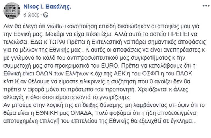 Ο αναπληρωτής πρόεδρος της ΕΠΟ, Νίκος Βακάλης, θέτει ζήτημα Σκίμπε και επιτελείου της Εθνικής και μέσω των social media τονίζει πως πρέπει να γίνουν αλλαγές εδώ και τώρα. Η ανάρτηση του προέδρου της ΕΠΣ Σάμου και αναπληρωτή προέδρου της ΕΠΟ στο Facebook: «Δεν θα έλεγα ότι νιώθω ικανοποίηση επειδή δικαιώθηκαν οι απόψεις μου για την Εθνική μας. Μακάρι να είχα πέσει έξω. Αλλά αυτό το αστείο πρέπει να τελειώσει. Εδώ και τώρα! Πρέπει η Εκτελεστική να πάρει σημαντικές αποφάσεις για το μέλλον της Εθνικής μας. Και αυτές οι αποφάσεις να είναι ανεπηρέαστες και με γνώμονα το καλό του αντιπροσωπευτικού μας συγκροτήματος και την συμμετοχή μας στα προκριματικά του Euro. Πρέπει να καταλάβουμε ότι η Εθνική είναι όλων των Ελλήνων και όχι της ΑΕΚ η του ΟΣΦΠ η του ΠΑΟΚ κ.λ.π. και εάν θέλουμε να είμαστε ειλικρινείς η συζήτηση που θα ανοίξει δεν θα πρέπει να αφορά μόνο στο πρόσωπο του προπονητή. Χρειάζονται και άλλες αλλαγές κ όλοι όσοι είμαστε κοντά το γνωρίζουμε. Αν μπούμε στην λογική της επίδειξης δύναμης, μη λαμβάνοντας υπ’ όψιν ότι το θέμα είναι η Εθνική μας ομάδα, πολύ φοβάμαι ότι η ήδη αποδεδειγμένα αποτυχημένη επιλογή του επιτελείου της Εθνικής θα εξελιχθεί σε έγκλημα…».