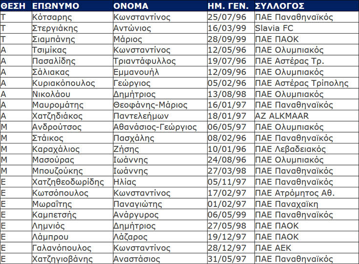 Την αποστολή της εθνικής Ελπίδων για τους δύο αγώνες μπαράζ με αντίπαλο την Αυστρία, που θα κρίνουν το «εισιτήριο» για την τελική φάση του Ευρωπαϊκού Πρωταθλήματος ανακοίνωσε ο Αντώνης Νικοπολίδης.