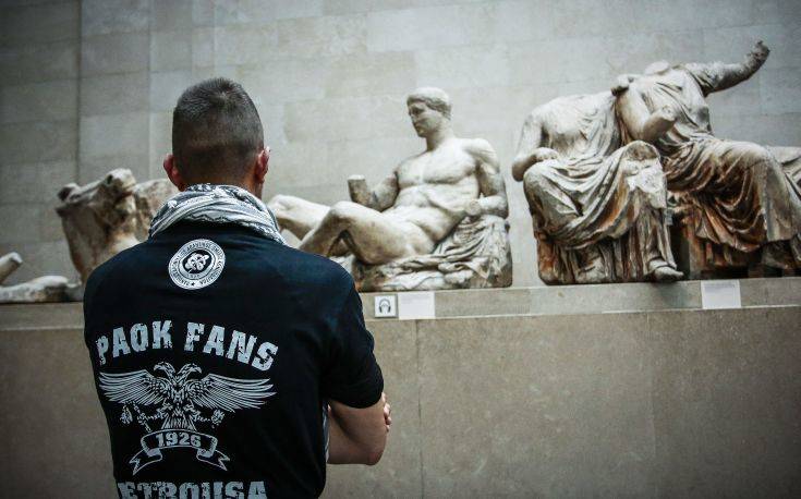 Μάλιστα, μία φωτογραφία που έχει γίνει viral στα κοινωνικά δίκτυα τις τελευταίες ώρες απαθανατίζει έναν οπαδό του ΠΑΟΚ την ώρα που θαυμάζει τα Γλυπτά του Παρθενώνα που εκτίθενται στο Βρετανικό Μουσείο.