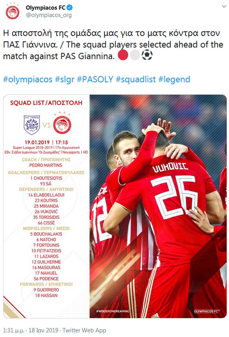 Αναλυτικά στην αποστολή του Ολυμπιακού βρίσκονται οι: Σα, Χουτεσιώτης, Ελαμπντελαουί, Κούτρης, Μιράντα, Βούκοβιτς, Τοροσίδης, Σισέ, Μπουχαλάκης, Νάτχο, Φορτούνης, Φετφατζίδης, Χριστοδουλόπουλος, Γκιγιέρμε, Μασούρας, Ναουέλ, Ποντένσε, Γκερέρο, Χασάν.