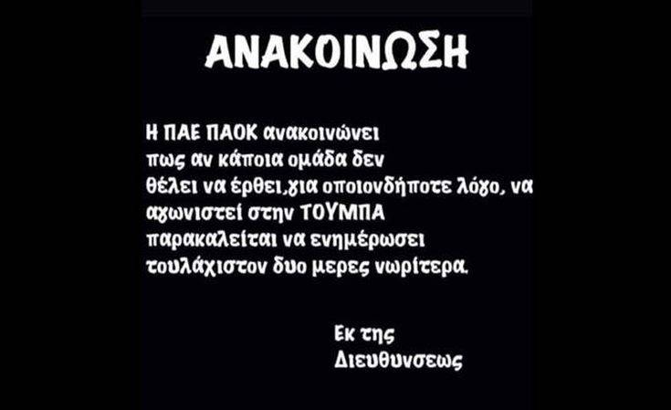 Το μέλος του «ασπρόμαυρου» Δ.Σ., που συνόδευσε την ομάδα στο χθεσινό ντέρμπι «δικεφάλων» στο ΟΑΚΑ, λίγο μετά το παιχνίδι, έγραψε: «Η ΠΑΕ ΠΑΟΚ ανακοινώνει πως αν κάποια ομάδα δεν θέλει να έρθει, για οποιονδήποτε λόγο, να αγωνιστεί στην Τούμπα παρακαλείται να ενημερώσει τουλάχιστον δύο ημέρες νωρίτερα. Εκ της διευθύνσεως».