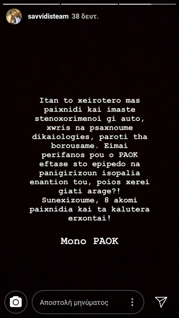 Είμαι περήφανος που ο ΠΑΟΚ έφτασε στο επίπεδο να πανηγυρίζουν ισοπαλία εναντίον του, ποιος ξέρει γιατί άραγε; Συνεχίζουμε, 8 ακόμη παιχνίδια και τα καλύτερα έρχονται! Μόνο ΠΑΟΚ», έγραψε ο Γιώργος Σαββίδης, μετά το ντέρμπι Θεσσαλονίκης με τον Άρη, που έληξε ισόπαλο 1-1.