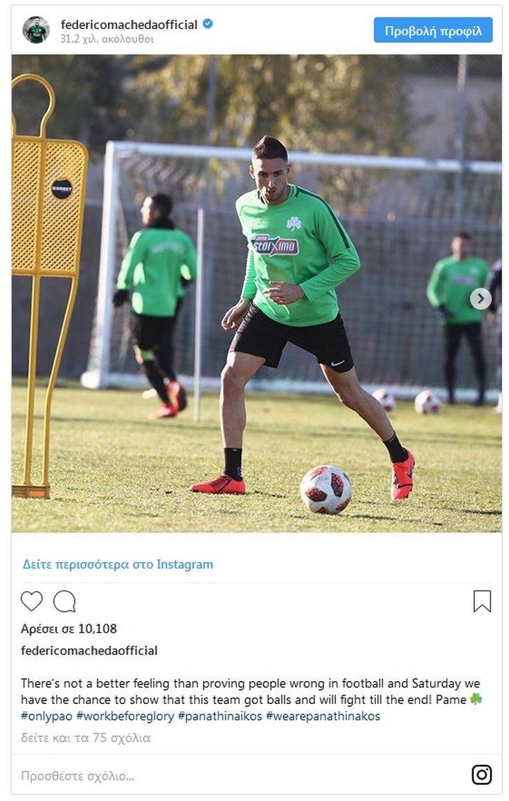 Ο Φεντερίκο Μακέντα μέσω Instagram, έγραψε πως ο ίδιος και οι συμπαίκτες του στον Παναθηναϊκό θα δείξουν πως έχουν… καρύδια και θα παλέψουν μέχρι τέλους, στο ματς του Σαββάτου με την ΑΕΚ.