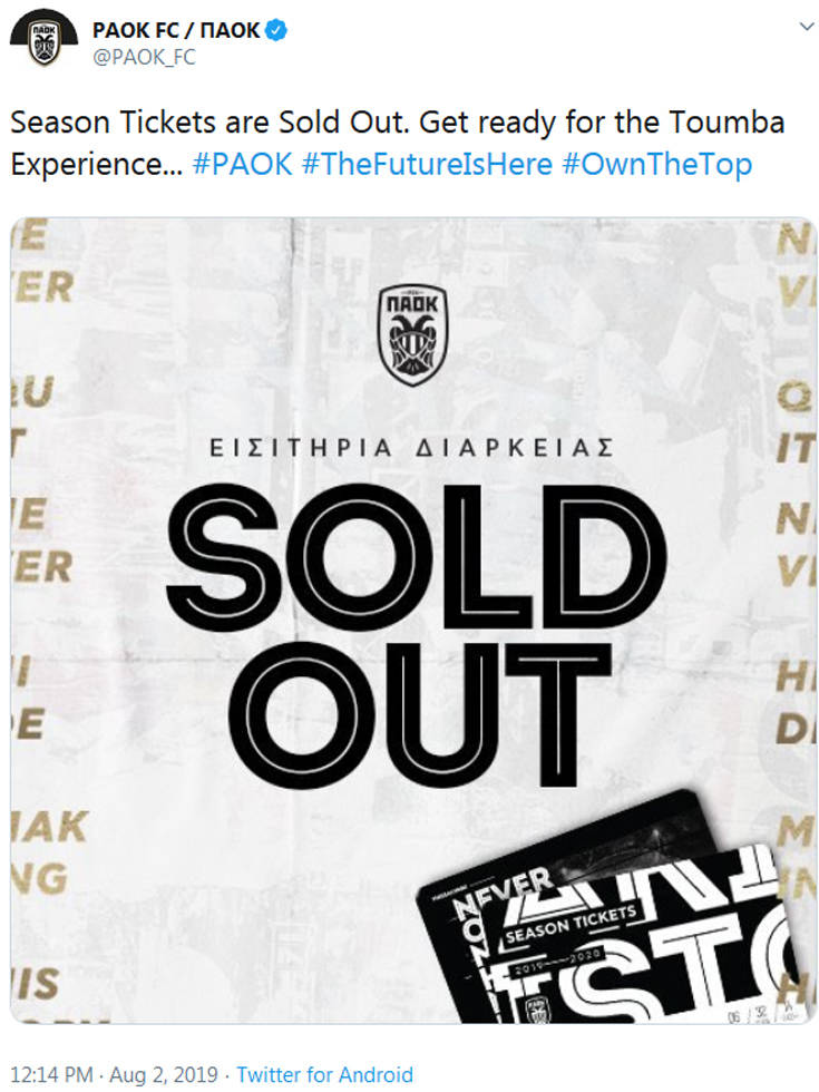 «Sold Out στα εισιτήρια διαρκείας. Ετοιμαστείτε για την εμπειρία της Τούμπας»», αναφέρει χαρακτηριστικά το tweet της ΠΑΕ ΠΑΟΚ. Αυτό σημαίνει ότι το γήπεδο της ομάδας θα είναι γεμάτο σε κάθε ματς, ενώ φαντάζει δεδομένο πως στα ντέρμπι και στα ευρωπαϊκά παιχνίδια δεν θα πέφτει… καρφίτσα.