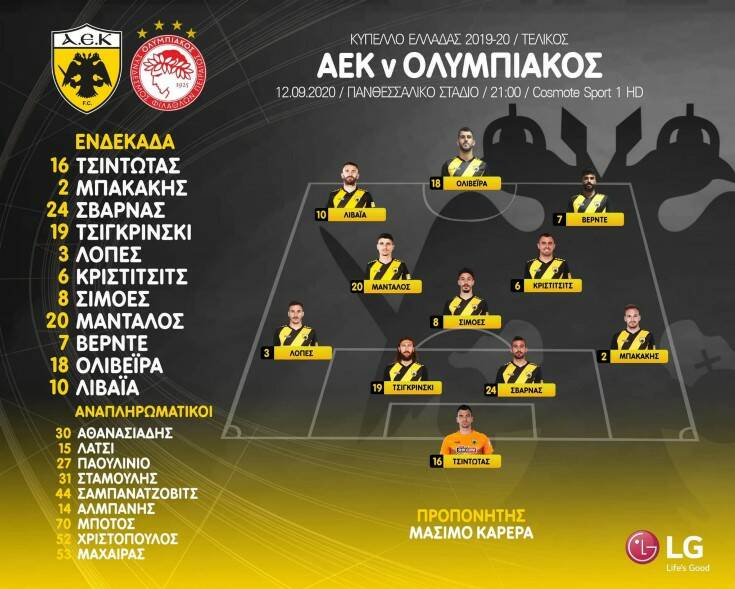 Η ΑΕΚ, λοιπόν, θα προσπαθήσει να το πετύχει αυτό παρατασσόμενη με 4-3-3 και με την εξής 11άδα: Στο τέρμα ο Τσιντώτας, δεξί μπακ ο Μπακάκης, αριστερά ο Λόπες και στόπερ οι Τσιγκρίνσκι και Σβάρνας. Στο χώρο του κέντρου είναι οι Σιμόες-Κρίστιτσιτς-Μάνταλος και από εκεί και πέρα ο Βέρντε θα κινείται σαν δεξί εξτρέμ, ο Λιβάια αριστερά και ο Ολιβέιρα θα είναι στην κορυφή της επίθεσης.