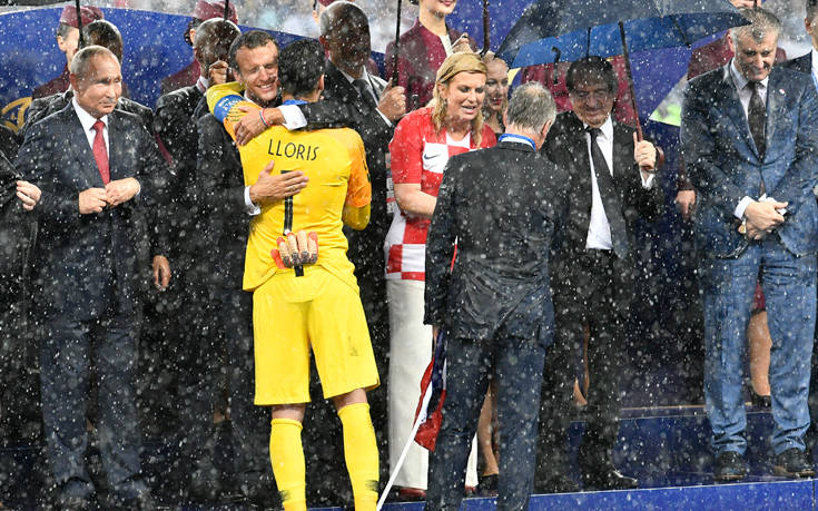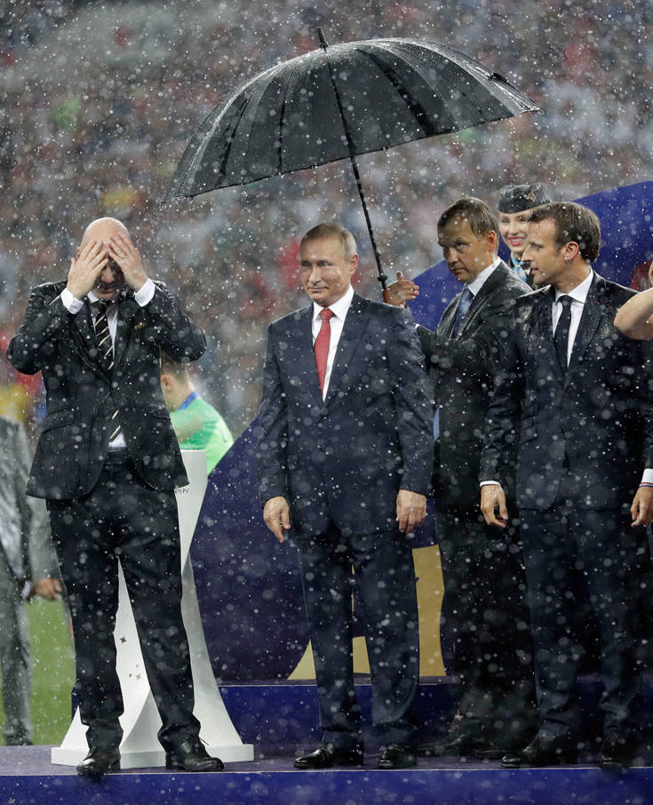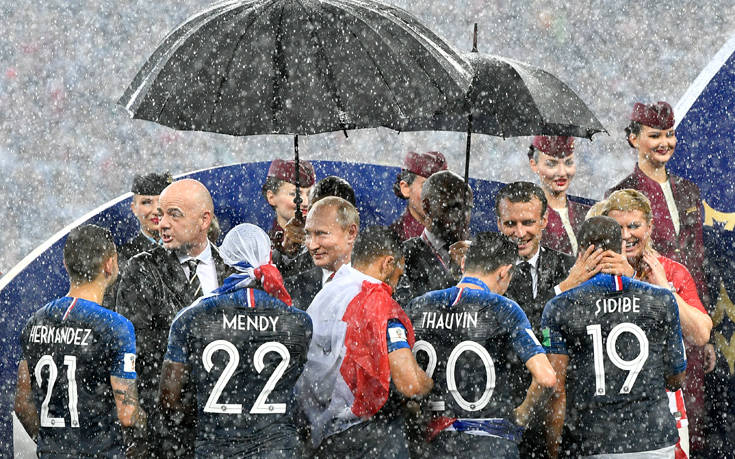 Οι ουρανοί άνοιξαν κατά τη διάρκεια του χθεσινού τελικού του Παγκοσμίου Κυπέλλου 2018, με αποτέλεσμα το Γαλλία-Κροατία να διεξαχθεί για πολλή ώρα με έντονη βροχόπτωση, όπως και τα μεθεόρτια για τη νίκη των «τρικολόρ». Και εάν για τους παίκτες του Ντιντιέ Ντεσάν το… μεθύσι της χαράς δεν επηρεάζονταν από τον καιρό, δεν συνέβαινε το ίδιο και για τους υπόλοιπους που βρέθηκαν στο κέντρο του «Λουζνίκι» για την απονομή τροπαίου και μεταλλίων. Τα δεδομένα δεν ήταν για όλους ίδια. Ως βασικός εκπρόσωπος της διοργανώτριας χώρας, ο Βλαντιμίρ Πούτιν είχε πάρει τα μέτρα του και ένας από τους ανθρώπους που φροντίζουν για την ασφάλειά του, κρατούσε συνεχώς μια ομπρέλα, προκειμένου ο Ρώσος πρόεδρος να βγει στεγνός από την καταιγίδα. Όπως και έγινε… Αντιθέτως, ο Γάλλος πρόεδρος, Εμανουέλ Μακρόν, η Κροάτισσα ομόλογός του, Κολίντα Γκράμπαρ-Κιτάροβιτς, αλλά και ο πρόεδρος της FIFA, Τζιάνι Ινφαντίνο, δεν ήταν στην ίδια μοίρα και βράχηκαν για τα καλά. Χαρακτηριστική είναι η κίνηση του Ιταλού ποδοσφαιροπαράγοντα, με τον ίδιο να πιάνει το κεφάλι του για να διώξει από εκεί το νερό, την ίδια ώρα που ο Πούτιν παρακολουθούσε ανέμελος το όλο σκηνικό…