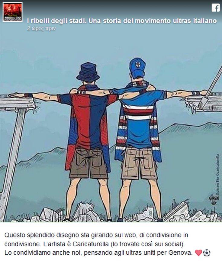 Ένα συγκινητικό σκίτσο αφιερωμένο στην τραγωδία στην Γένοβα και την τραγωδία με την κατάρρευση της γέφυρας κάνει το γύρο του διαδικτύου, με πρωταγωνιστές τους οπαδούς της Τζένοα και της Σαμπντόρια. Οι οπαδοί των δύο ομάδων, όπως και ολόκληρο το ιταλικό ποδόσφαιρο, συγκλονισμένοι από την τραγωδία στην Γένοβα με την κατάρρευση της γέφυρας, ενώθηκαν σε αυτές τις δύσκολες στιγμές. Ο καλλιτέχνης Caricaturella εμπνεύστηκε από αυτό και δημιούργησε αυτό το εκπληκτικό σκίτσο.