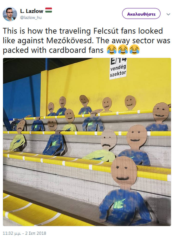 Η ομάδα που φέρει το όνομα του θρυλικού Ούγγρου ποδοσφαιριστή, δεν μπορούσε να έχει τον -ομολογουμένως λίγο- κόσμο στο πλευρό της, καθώς τα 400 χιλιόμετρα που χωρίζουν τις δύο πόλεις δεν ήταν ό,τι πιο δελεαστικό. Έτσι, για να μην μείνουν οι παίκτες και το τεχνικό επιτελείο της Ακαδημίας Πούσκας παραποιούμενοι, οι οικοδεσπότες έφτιαξαν μια κερκίδα με… φιλάθλους, έστω κι αν ήταν από χαρτόνι.