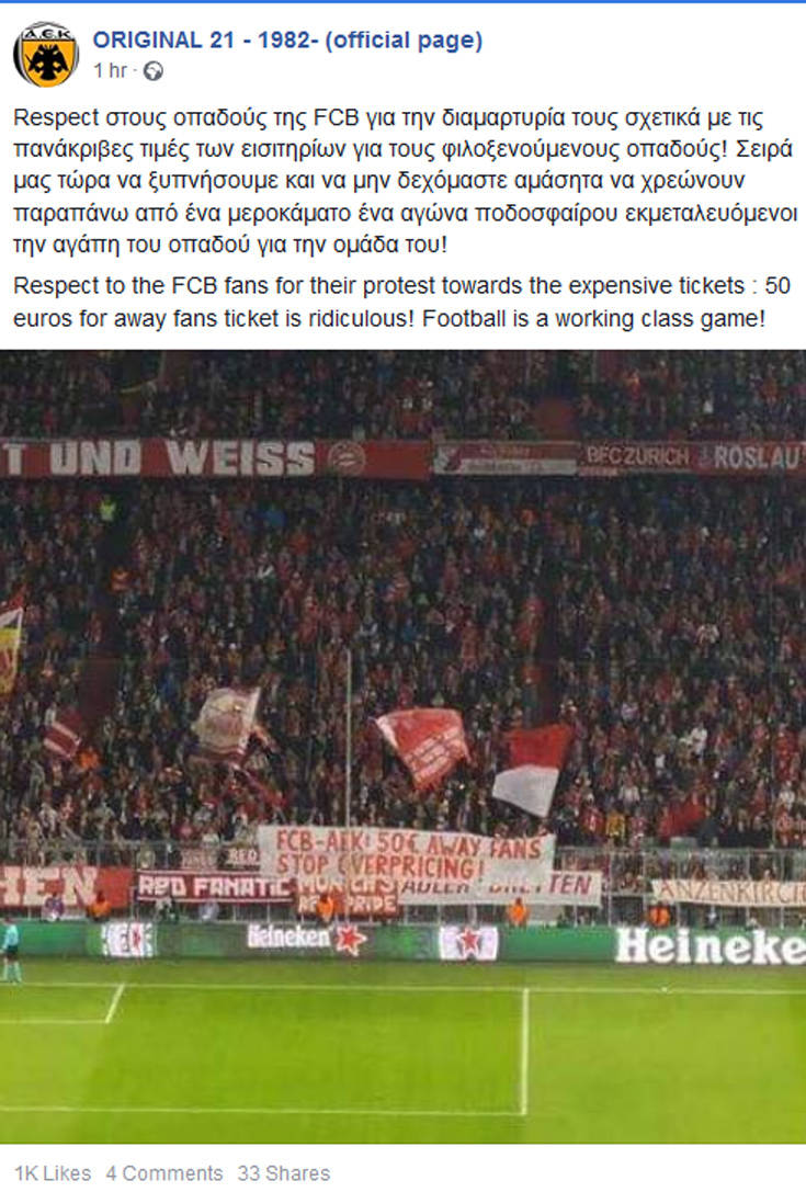 «Respect στους οπαδούς της FCB για την διαμαρτυρία τους σχετικά με τις πανάκριβες τιμές των εισιτηρίων για τους φιλοξενούμενους οπαδούς! Σειρά μας τώρα να ξυπνήσουμε και να μην δεχόμαστε αμάσητα να χρεώνουν παραπάνω από ένα μεροκάματο ένα αγώνα ποδοσφαίρου εκμεταλευόμενοι την αγάπη του οπαδού για την ομάδα του!’», ήταν το μήνυμα στην επίσημη σελίδα της Original 21 στο Facebook.