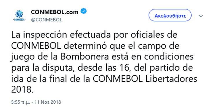 Οι άνθρωποι της Conmebol έκαναν τον προγραμματισμένο για τις 16:00, έλεγχο στον αγωνιστικό χώρο του «Μπομπονέρα» για να διαπιστώσουν αν θα διεξαχθεί σήμερα (21:00 ώρα Ελλάδας) το superclasico και η απόφαση που πάρθηκε ήταν θετική για το ματς που περιμένει όλος ο ποδοσφαιρικός πλανήτης.