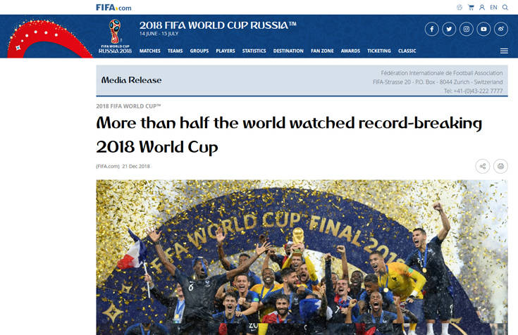 Ο τελικός μεταξύ Γαλλίας και Κροατίας, στις 15 Ιουλίου, προσέλκυσε -σύμφωνα με τη FIFA– ένα συνολικό παγκόσμιο ακροατήριο 1,12 δισεκατομμυρίων ατόμων, το οποίο περιλαμβάνει 884,37 εκατομμύρια τηλεθεατές και 231,82 εκατομμύρια θεατές που παρακολούθησαν το συναρπαστικό ματς από άλλες πλατφόρμες.
