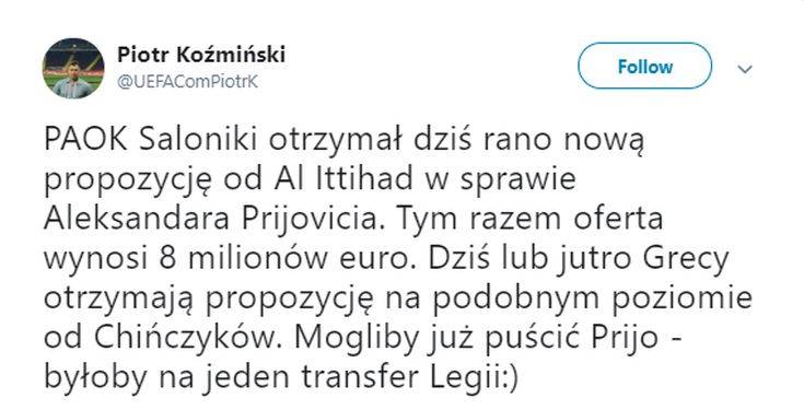 Σύμφωνα με τον Πολωνό δημοσιογράφο, Πιοτρ Κοζμίνσκι, ο «δικέφαλος» του Βορρά έχει στα χέρια του πρόταση 8 εκατομμυρίων ευρώ από την Αλ Ιτιχάντ της Σαουδικής Αραβίας για το Σέρβο επιθετικό, ενώ όπως αναφέρει με σχετικό tweet του, αναμένεται μια αντίστοιχη πρόταση και από την Κίνα.