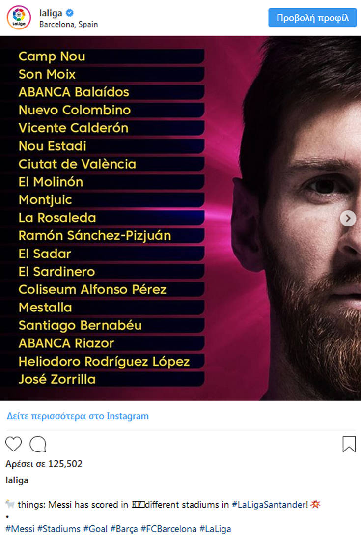 Φτάνοντας στα 19 γκολ στο πρωτάθλημα για την τρέχουσα αγωνιστική περίοδο, ο Λιονέλ Μέσι κατάφερε πλέον να σκοράρει σε 37 γήπεδα επί ισπανικού εδάφους, προσθέτοντας και το Μοντιλίβι στη λίστα του…