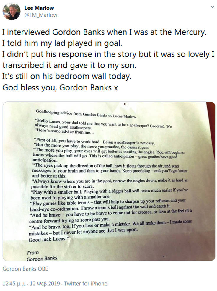 Η είδηση θανάτου του Γκόρντον Μπανκς βύθισε στη θλίψη όλους τους λάτρεις του ποδοσφαίρου στον πλανήτη. Ο θρυλικός Άγγλος τερματοφύλακας άφησε χθες την τελευταία του πνοή σε ηλικία 81 ετών και ο Λι Μάρλοου, από την εφημερίδα Leicester Mercury, με αφορμή το γεγονός αποκάλυψε ένα γράμμα που του είχε αφήσει εκείνος.