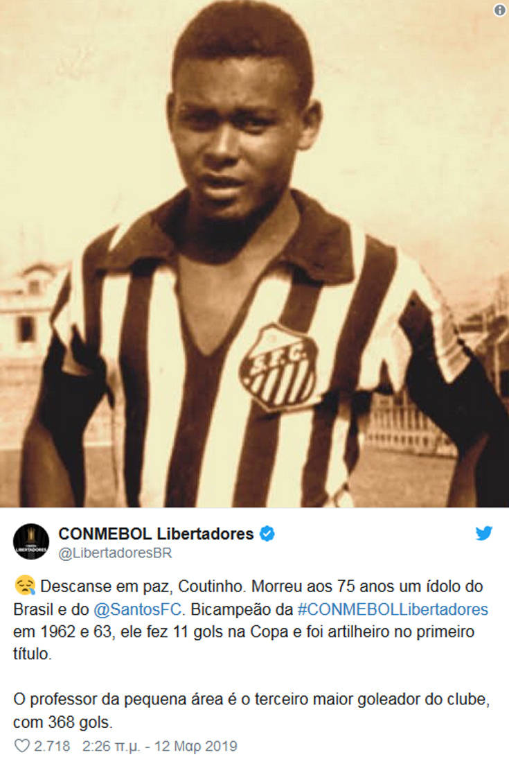 Έφυγε από τη ζωή, σε ηλικία 75 ετών, ο άνθρωπος που αποτέλεσε τον καλύτερο συμπαίκτη του Πελέ, σύμφωνα με τα όσα είχε πει ο ίδιος ο θρυλικός Βραζιλιάνος ποδοσφαιρικός αστέρας.