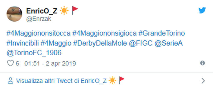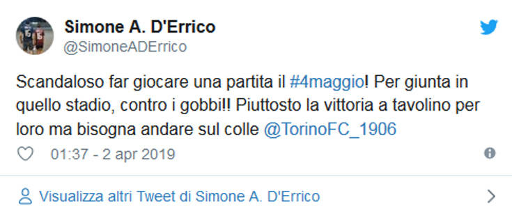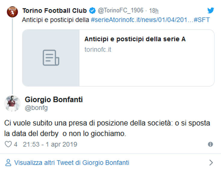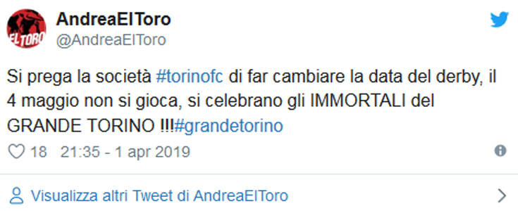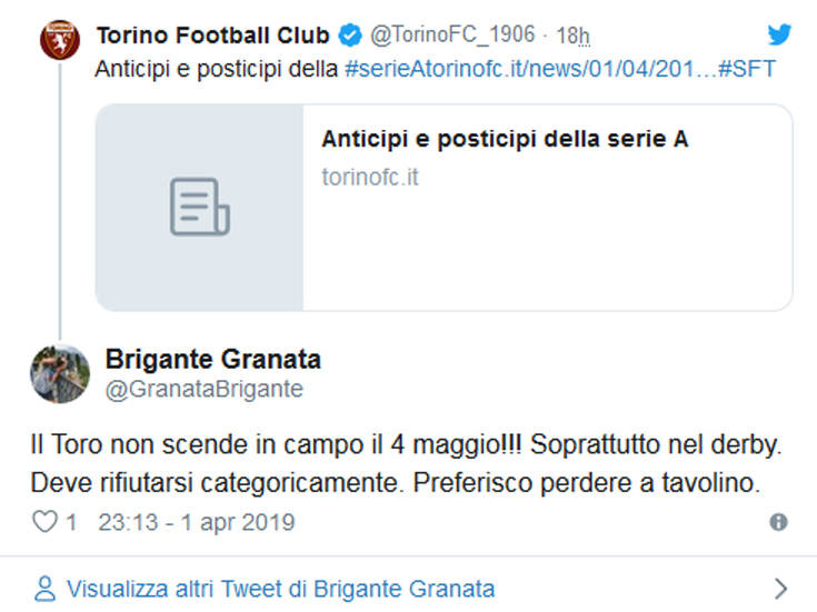 Πιο συγκεκριμένα, άφησαν έναν αστερίσκο για το παιχνίδι της 17ης αγωνιστικής του δευτέρου γύρου μεταξύ Γιουβέντους και Τορίνο στο γήπεδο της πρώτης, πως μπορεί να μεταφερθεί στις 4 Μαΐου, στις 3 το μεσημέρι, σε περίπτωση που οι «μπιανκονέρι» προκριθούν στα ημιτελικά του Champions League, κάτι που δεν είναι και απίθανο να συμβεί. Αυτό προκάλεσε την αντίδραση από πλευράς «γκρανάτα» και κυρίως των οπαδών της, καθώς το ματς αυτό θα πέφτει πάνω στην 70ή επέτειο από την τραγωδία στον λόφο της Σουπέργκα.