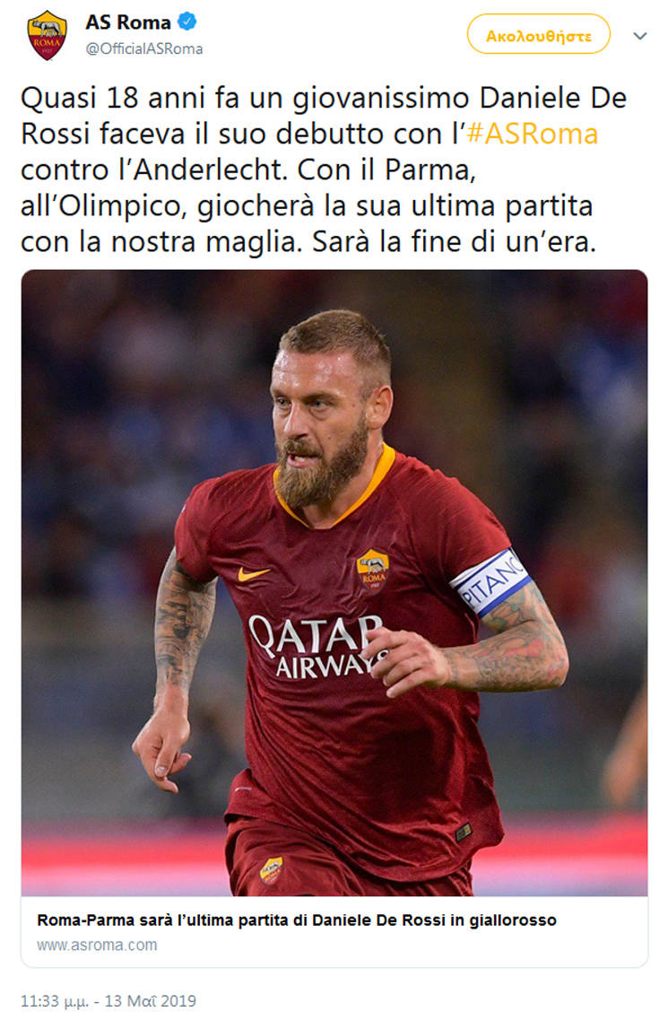 «Πριν περίπου 18 χρόνια ο Ντανιέλε Ντε Ρόσι έκανε ντεμπούτο με τη Ρόμα απέναντι στην Άντερλεχτ. Απέναντι στην Πάρμα στο “Ολίμπικο” θα παίξει το τελευταίο του παιχνίδι με τη φανέλα μας. Θα είναι το τέλος μιας εποχής», έγραψε στον λογαριασμό του στο Twitter ο σύλλογος.