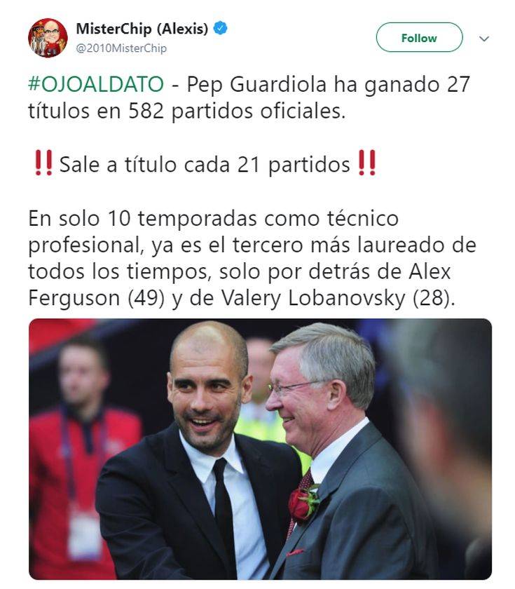 Μετά το πρωτάθλημα και το Λιγκ Καπ, οι «πολίτες»… σκούπισαν τα πάντα στο Νησί, με τον Καταλανό τεχνικό να φτάνει στους 27 τίτλους σε 582 επίσημα ματς. Αυτό σημαίνει ότι κάθε… 21 παιχνίδια σηκώνει και μια κούπα, ενώ είναι πλέον στην τρίτη θέση όλων των εποχών σε παγκόσμιο επίπεδο, πίσω μόνο από τους σερ Αλεξ Φέργκιουσον που έχει 49 και Βαλερί Λομπανόφσκι με 28.