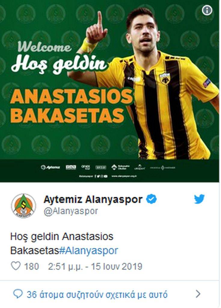 «Η ΠΑΕ ΑΕΚ ανακοινώνει την παραχώρηση του ποδοσφαιριστή Τάσου Μπακασέτα στην τουρκική ομάδα Αlanyaspor.