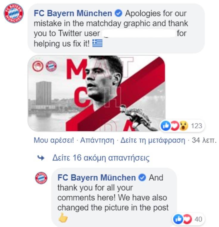 Έτσι, η γερμανική ομάδα άλλαξε τη φωτογραφία με μία από το λιμάνι του Πειραιά, γράφοντας σε μήνυμα: «Ζητάμε συγγνώμη για το λάθος με τη φωτογραφία για το ματς με τον Ολυμπιακό. Ευχαριστούμε όλους για τα μηνύματά τους, έχουμε αλλάξει και τη φωτογραφία στην ανάρτηση».