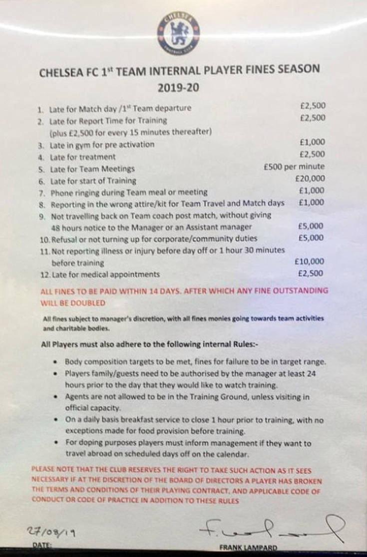 Ο Φρανκ Λάμπαρντ έχει καταφέρει να μυήσει τους νεαρούς ποδοσφαιριστές της ομάδας σε απόλυτα αυστηρή και επαγγελματική νοοτροπία, με τον εσωτερικό κανονισμό να είναι τέτοιους που περιλαμβάνει απίστευτα πρόστιμα ανάλογα με το… ατόπημα που ενδέχεται να σημειωθεί.