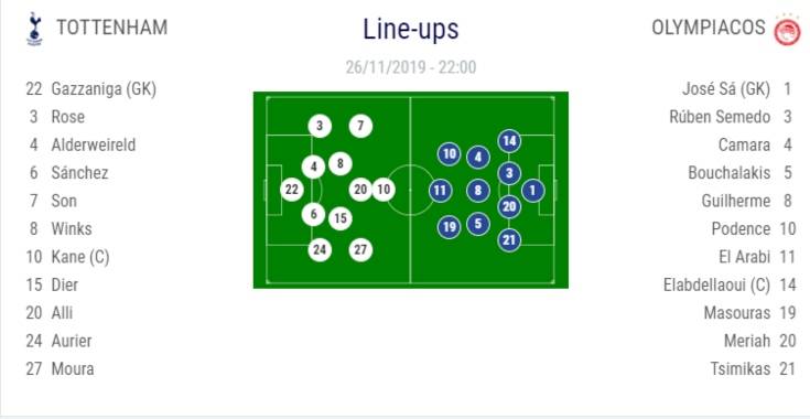 Από την άλλη ο Ζοζέ Μουρίνιο επέλεξε τους: Γκαζανίγκα, Οριέ, Αλντερβάιρελντ, Σάντσες, Ρόουζ, Ντίερ, Γουίνκς, Ντέλε Αλι, Λούκας Μόουρα, Σον, Κέιν.