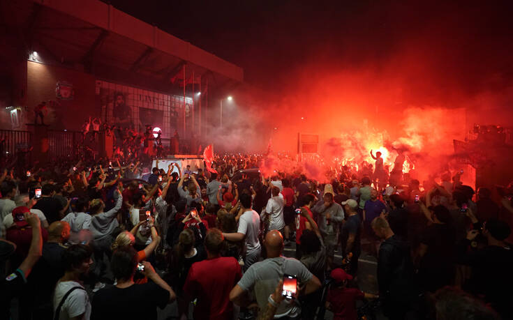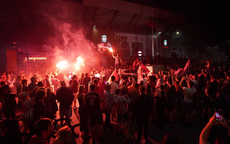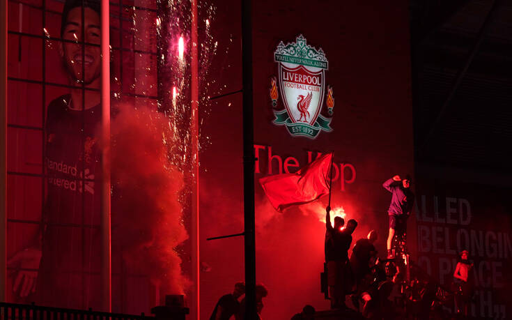 Οι φίλοι της Λίβερπουλ δεν άργησαν να συγκεντρωθούν έξω από το «Άνφιλντ» για να γιορτάσουν το πρωτάθλημα των Reds, με σημαίες, καπνογόνα και συνθήματα.
