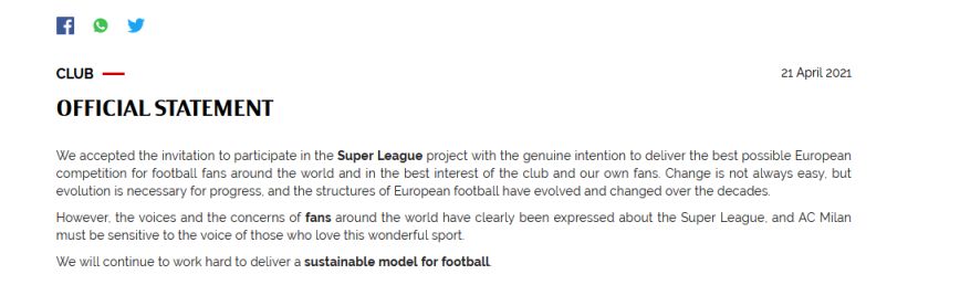 Οι Μιλανέζοι χωρίς να αναφέρουν ρητά ότι αποχωρούν αναφέρουν μεταξύ άλλων ότι «αφουγκράστηκαν τις φωνές των οπαδών σε όλη τον κόσμο όσον αφορά την συμμετοχή της στη Λίγκα καθώς και την ίδια τη Σούπερ Λιγκ»