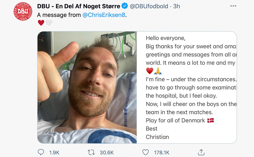 Από το κρεβάτι του νοσοκομείου τη Δευτέρα ο Έρικσεν, που σταθεροποιήθηκε, έβγαλε μία δήλωση πως δεν τα παρατά ποτέ. Μέσω του μάνατζέρ του Μάρτιν Σουτς, ο 29χρονος δήλωσε στη Gazzetta Dell Sport πως «ευχαριστώ όλους τους φιλάθλους. Δεν τα παρατάω. Νιώθω πιο καλά τώρα. Θέλω όμως να καταλάβω το τι έγινε. Θέλω να ευχαριστήσω όλους εσάς για ότι κάνατε για μένα και όσους με βοήθησαν».