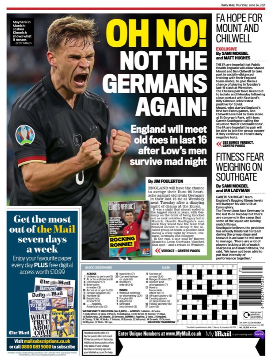 Η μεγάλη κόντρα Αγγλίας και Γερμανίας, αλλά πολύ περισσότερο ο πόνος που έχουν προκαλέσει τα «πάντσερ» στους Βρετανούς, έκανε την Daily Mail να κυκλοφορήσει με τρομερό τίτλο το πρωί της Πέμπτης!
