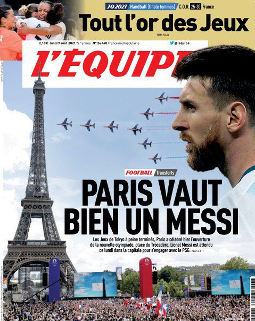 Με ένα εντυπωσιακό πρωτοσέλιδο η γαλλική εφημερίδα «L’ Equipe» καλωσορίζει τον Λιονέλ Μέσι στο Παρίσι.