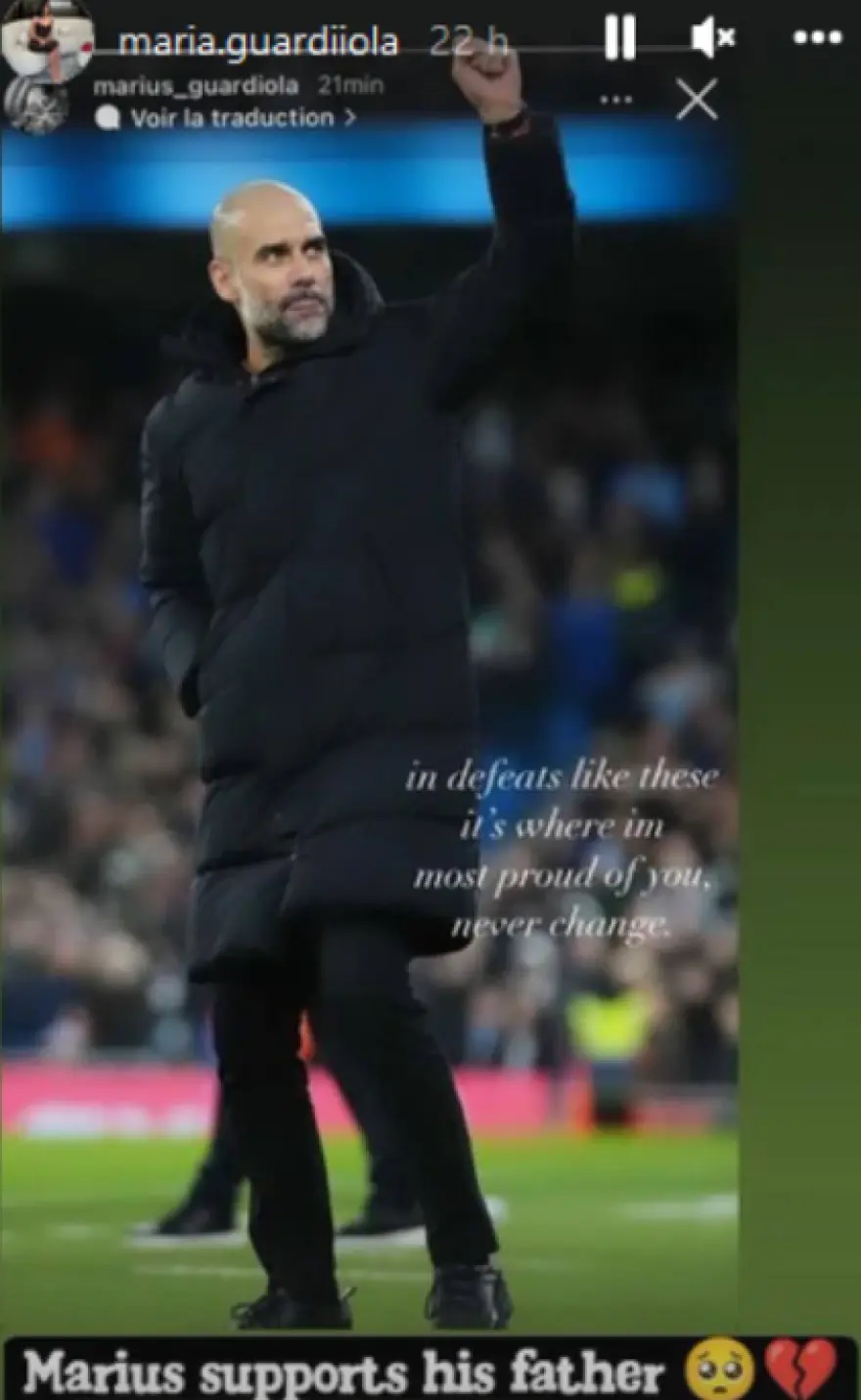 «Σε ήττες όπως αυτή είναι που είμαι πιο περήφανη για σένα. Δεν αλλάζουν ποτέ τα συναισθήματα μου» έγραψε σε story στο Instagram η κόρη του Πεπ, Μαρία εκφράζοντας τον θαυμασμό της για τον μπαμπά της.