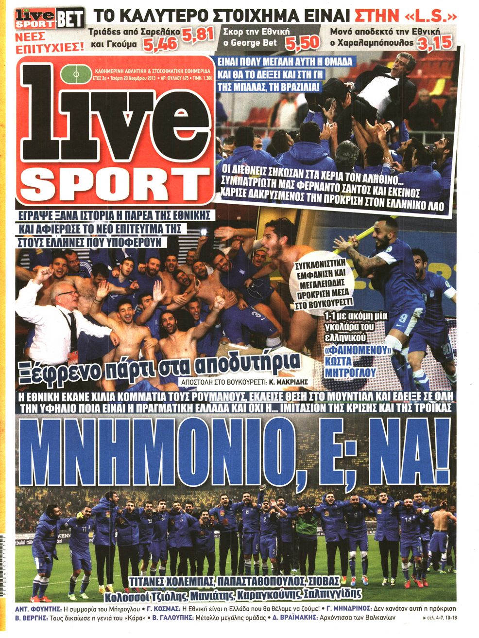 Τα πρωτοσέλιδα πολιτικών και αθλητικών εφημερίδων φιλοξενούν σήμερα την πρόκριση της Εθνικής Ελλάδας στην τελική φάση του Μουντιάλ στη Βραζιλία.