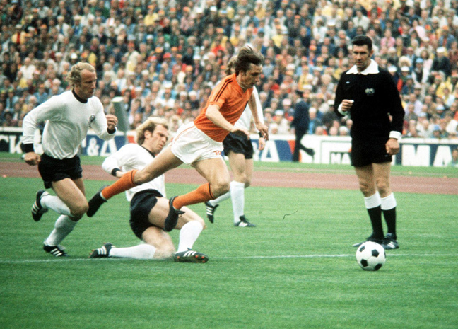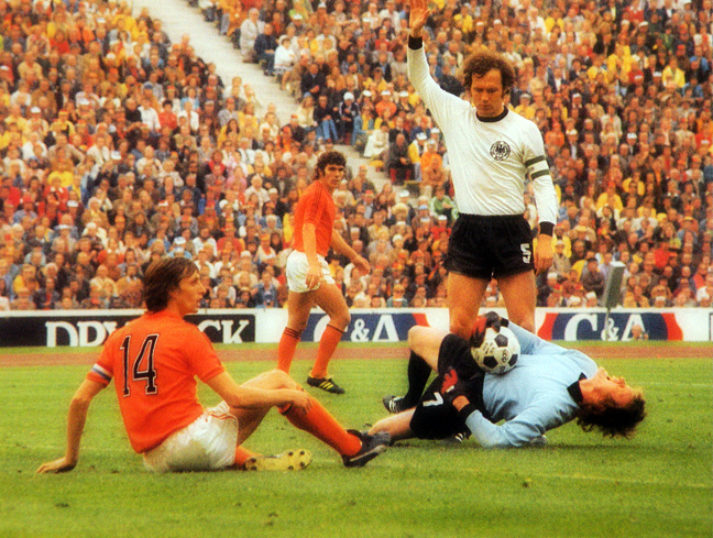 Και βέβαια η καλύτερη ώρα του ήρθε στο Παγκόσμιο Κύπελλο του 1974 στα γήπεδα της Δυτικής Γερμανίας, όταν οι Οράνιε άφησαν τον κόσμο με το στόμα ανοιχτό με το «ολοκληρωτικό ποδόσφαιρό» τους. Ο μεσοεπιθετικός Κρόιφ οργώνει το γήπεδο και βρίσκεται πρακτικά παντού…