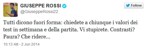«Όλοι λένε πως είμαι εκτός φόρμας: ρωτήστε όποιον θέλετε για τα αποτελέσματα των εξετάσεων αυτής της εβδομάδας και του αγώνα. Θα εκπλαγείτε…Φτάνω γρηγορότερα από τον αμυντικό με τη σκέψη μου. Την επόμενη φορά, ως ερασιτέχνης, θα περιμένω τον αμυντικό για να με κλωτσήσει. Τάκλιν; Φόβος; Όλα αυτά που γράφονται είναι για να γελάει κανείς», ήταν το πρώτο σχόλιο του διεθνούς άσου στο Twitter και τόνισε στο τέλος: «Το σημαντικότερο πράγμα τώρα είναι να υποστηρίξουμε την Ιταλία. Forza Azzuri!!».