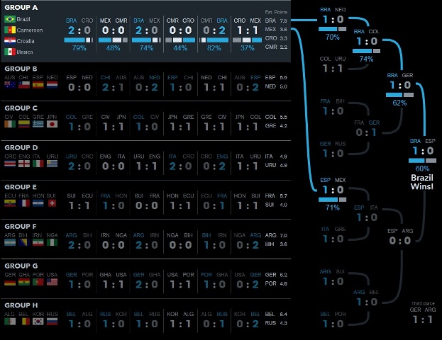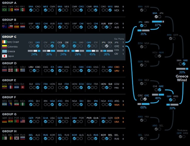 Η ανάλυση γίνεται ανά όμιλο και τελικά προβλέπεται ο μεγάλος νικητής. Σύμφωνα με τις προβλέψεις του Bloomberg φαβορί για την κατάκτηση του τίτλου είναι φυσικά η Βραζιλία και ακολουθούν η Ισπανία, η Γερμανία και η Αργεντινή.