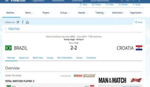 Στην επίσημη ιστοσελίδα της η Παγκόσμια Ποδοσφαιρική Ομοσπονδία έχει βιαστεί να αναγράψει το σκορ της αναμέτρησης μεταξύ της Βραζιλίας και της Κροατίας, η οποία έληξε 2-2!